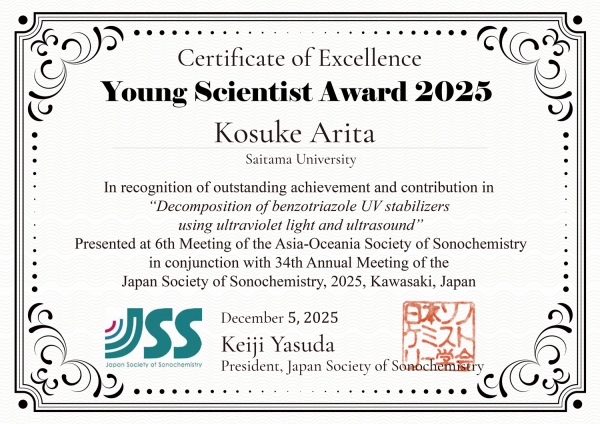 Young Scientist Award 2025 6th Meeting of the Asia-Oceania Society of Sonochemistry Decomposition of benzotriazole UV stabilizers using ultraviolet light and ultrasound |